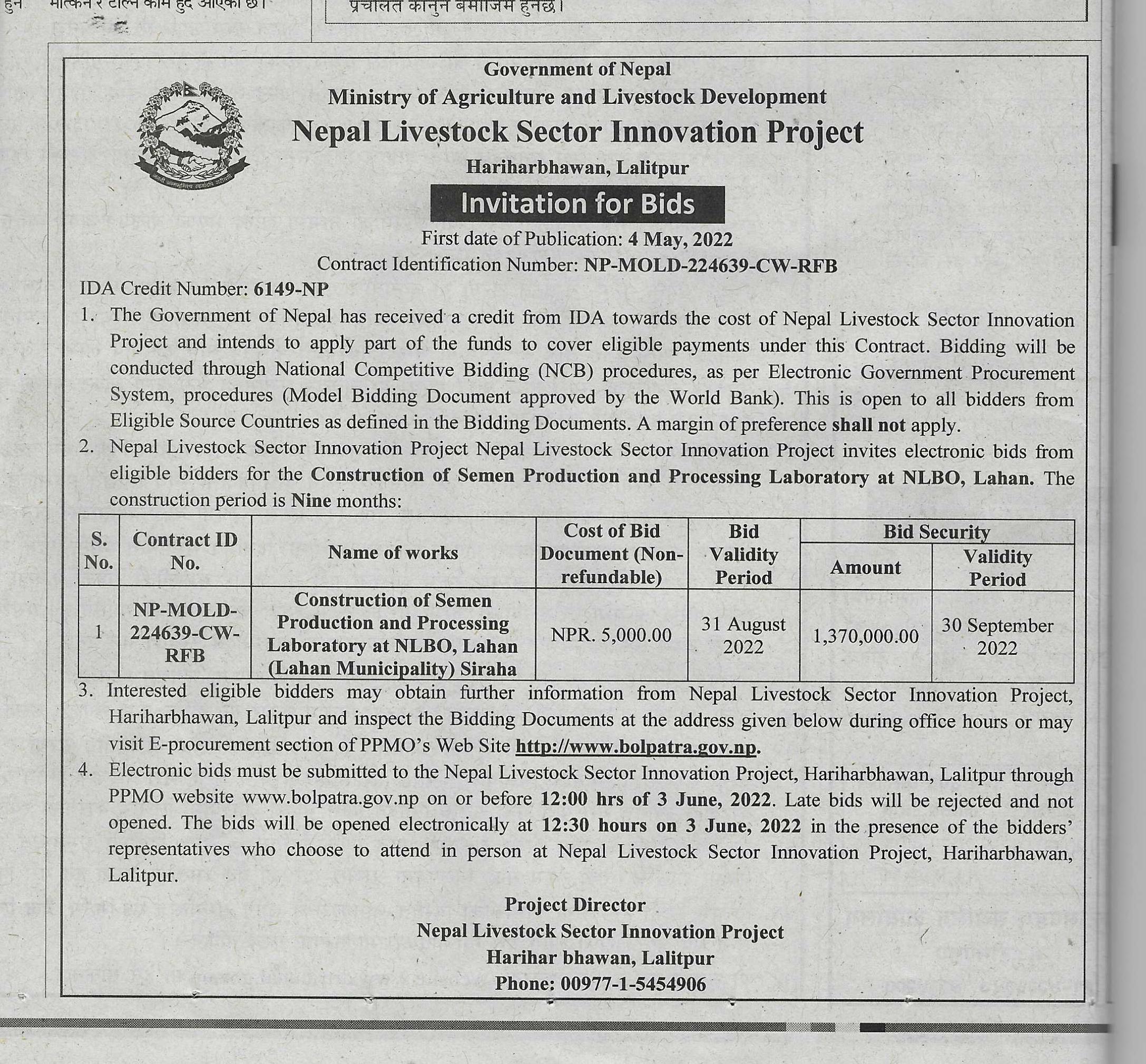 1. Invitation for Bid for the Construction of Semen Production and Processing Laboratory at NLBO, Lahan (Lahan Municipality) Siraha